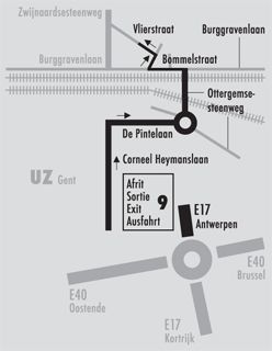 Sortez de la gare de Gent St.-Pieters par la sortie principale. En sortant, prenez directement à droite et suivez 'Prinses Clementinalaan' et 'Burggravenlaan'. Au deuxième feu rouge, allez légèrement à gauche et continuez dans 'Lucas De Heerestraat'. Ensuite prenez à droite dans la 'Vlierstraat'.